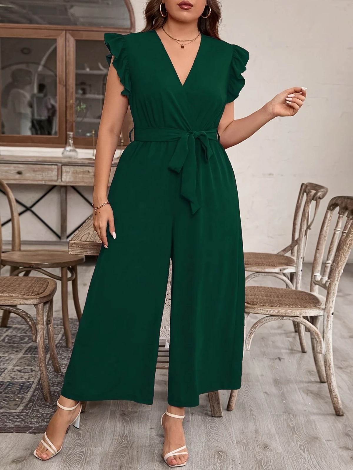 Make a stylish statement in this vibrant emerald green jumpsuit that combines effortless elegance with vacation-ready comfort. The flattering V-neckline and playful ruffle sleeves create a feminine silhouette, while the adjustable waist belt defines your shape beautifully.
