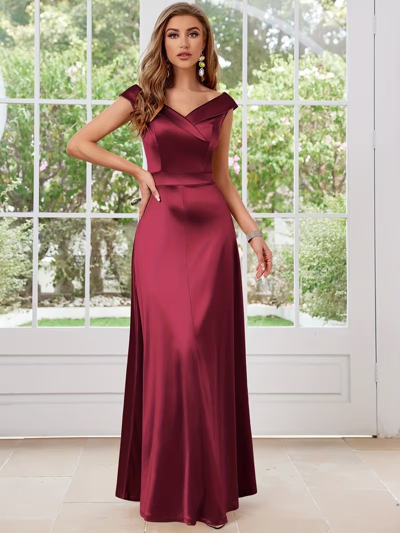 This elegant satin evening dress is designed to bring refined sophistication to cocktail events, formal occasions, and special celebrations. Featuring a flattering V-neckline and fit-and-flare silhouette, it accentuates the waist while creating graceful movement through the full-length skirt. The satin-inspired finish adds a smooth, luminous effect that enhances its elevated occasionwear appeal. Crafted for comfort as well as structure, it offers a polished drape while maintaining a feminine, timeless silhouette. A classic statement piece for elegant event dressing.